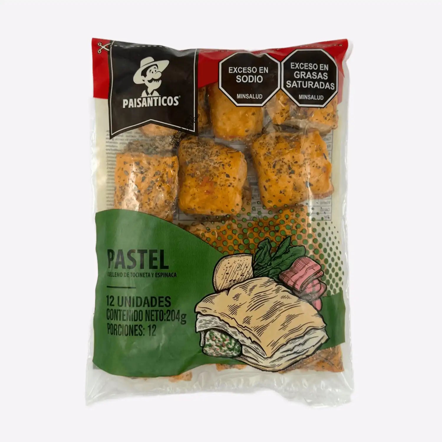Sabor y Textura: Pasteles cuadrados de masa hojaldrada crocante, rellenos con una mezcla cremosa de tocineta, espinaca y queso crema. Su aroma es característico y su color dorado refleja una cocción perfecta.